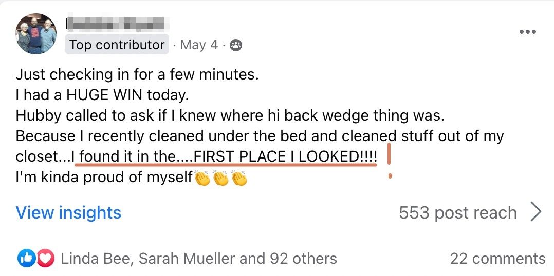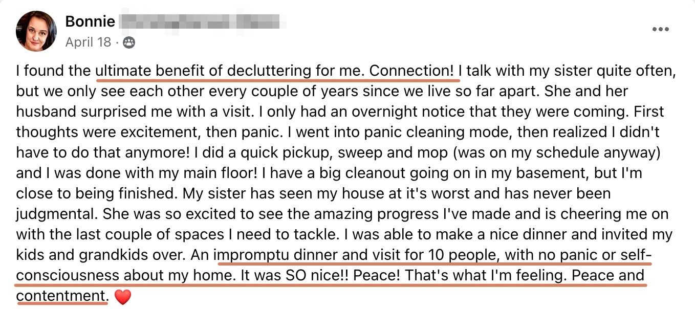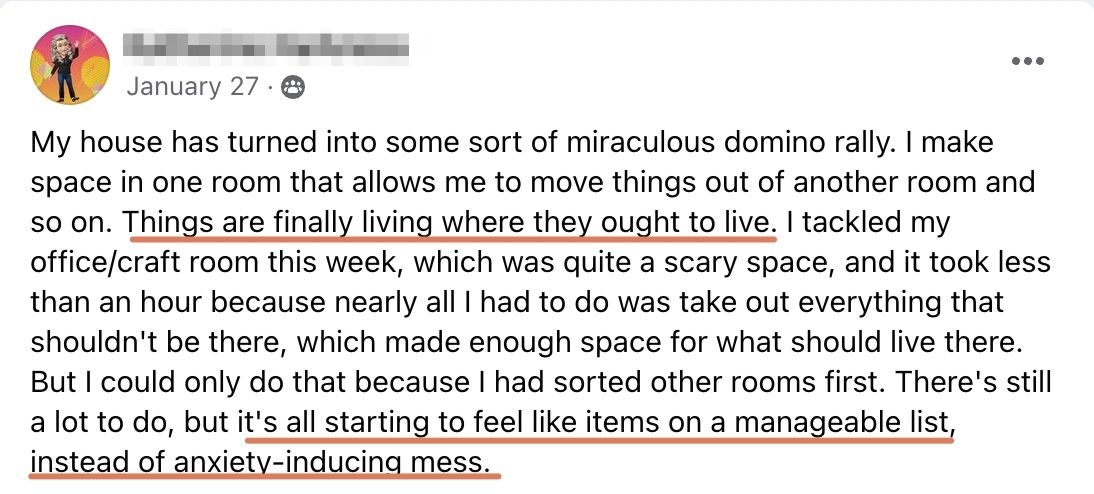 Our members are making real progress in their decluttering and learning how mindset and our brains play a role in clutter and what to do about it.